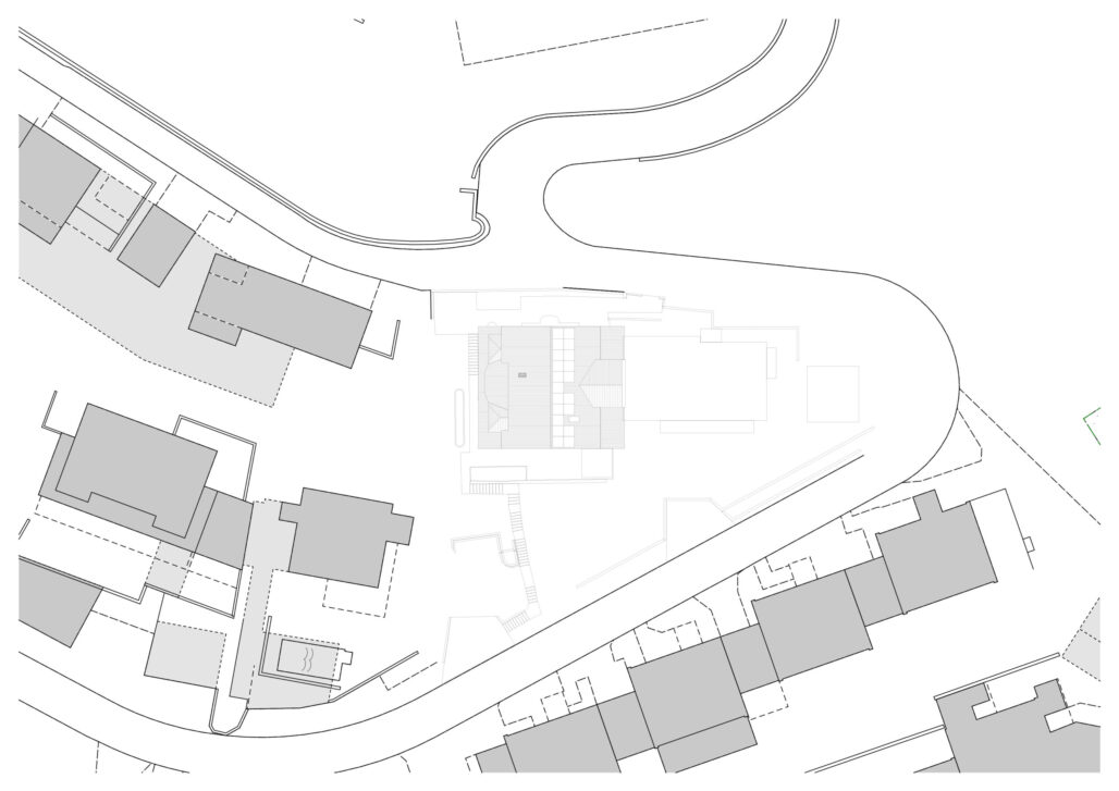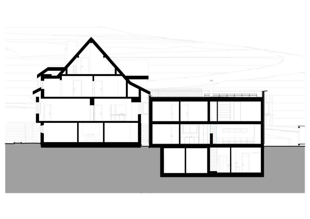 Der markante Ursprungsbau wurde um einen zurückhaltenden und im Ausdruck bescheidenen Anbau ergänzt. Die ursprünglich von einer Grossfamilie bewohnte Liegenschaft besitzt nun drei Wohneinheiten mit individuellen Aussenbereichen und einem grossen Gemeinschaftsgarten. Die Innenräume im Bestand sind geprägt von zeittypischen Ausbauten aus Holz, welche sorgfältig renoviert und für die nächste Nutzungsperiode vorbereitet wurden. Für den Einbau der beiden neuen Wohneinheiten waren nur wenige punktuelle Eingriffe notwendig. Im Anbau wiederum wird eine Raumfolge etabliert, welche sich aus der Hanglage und der aussergewöhnlichen Aussicht ergibt.